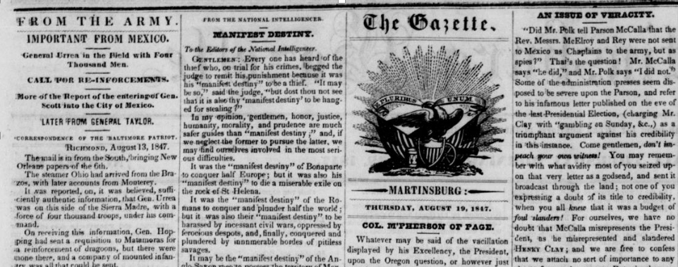 The Gate City (Iowa)، "Manifest Destiny" و"Important from Mexico"، 5 أغسطس 1847. Chronicling America، مكتبة الكونغرس. [https://www.loc.gov/resource/sn84038468/1847-08-19/ed-1/?sp=2&q=manifest+destiny&r=-1.224,0,3.448,1.371,0]